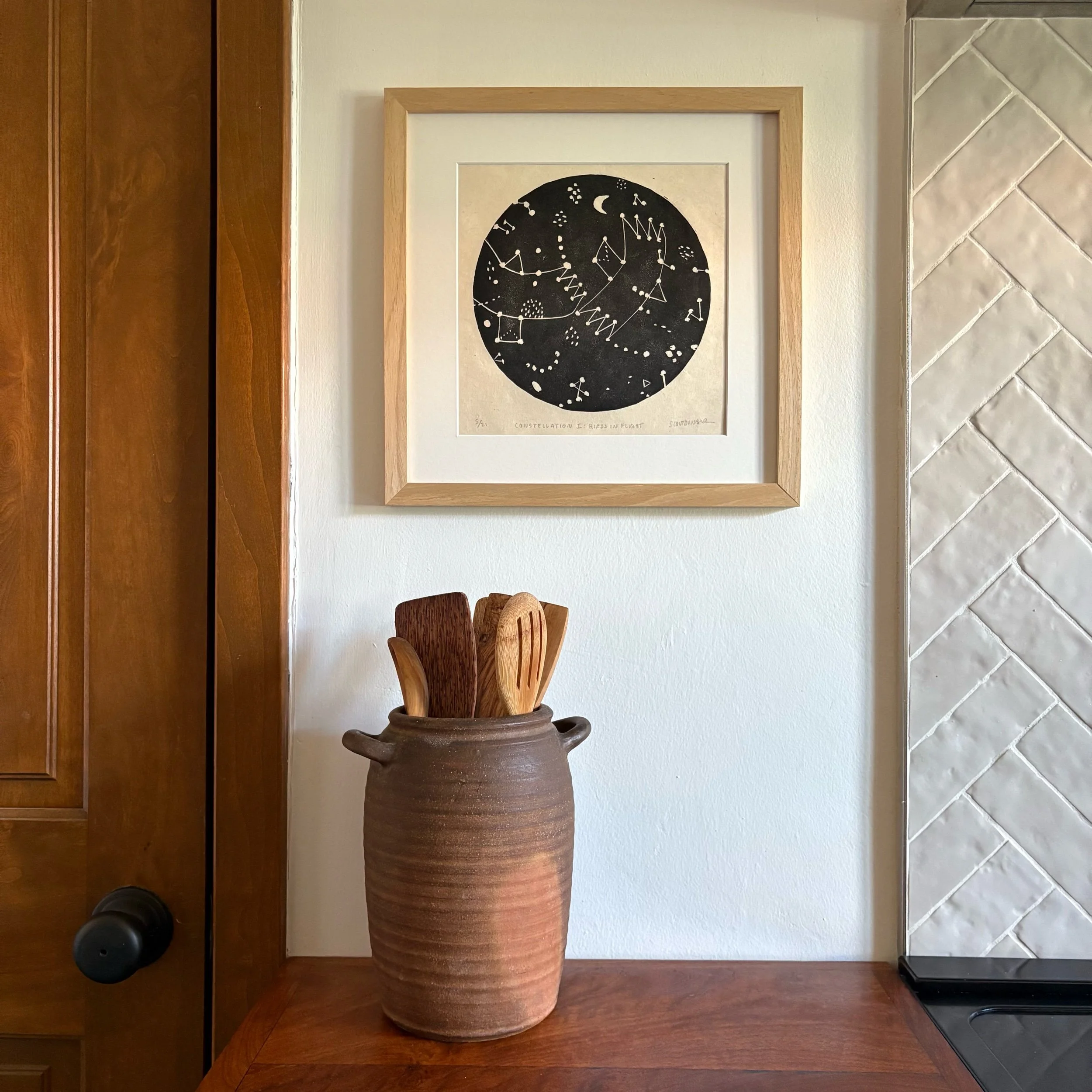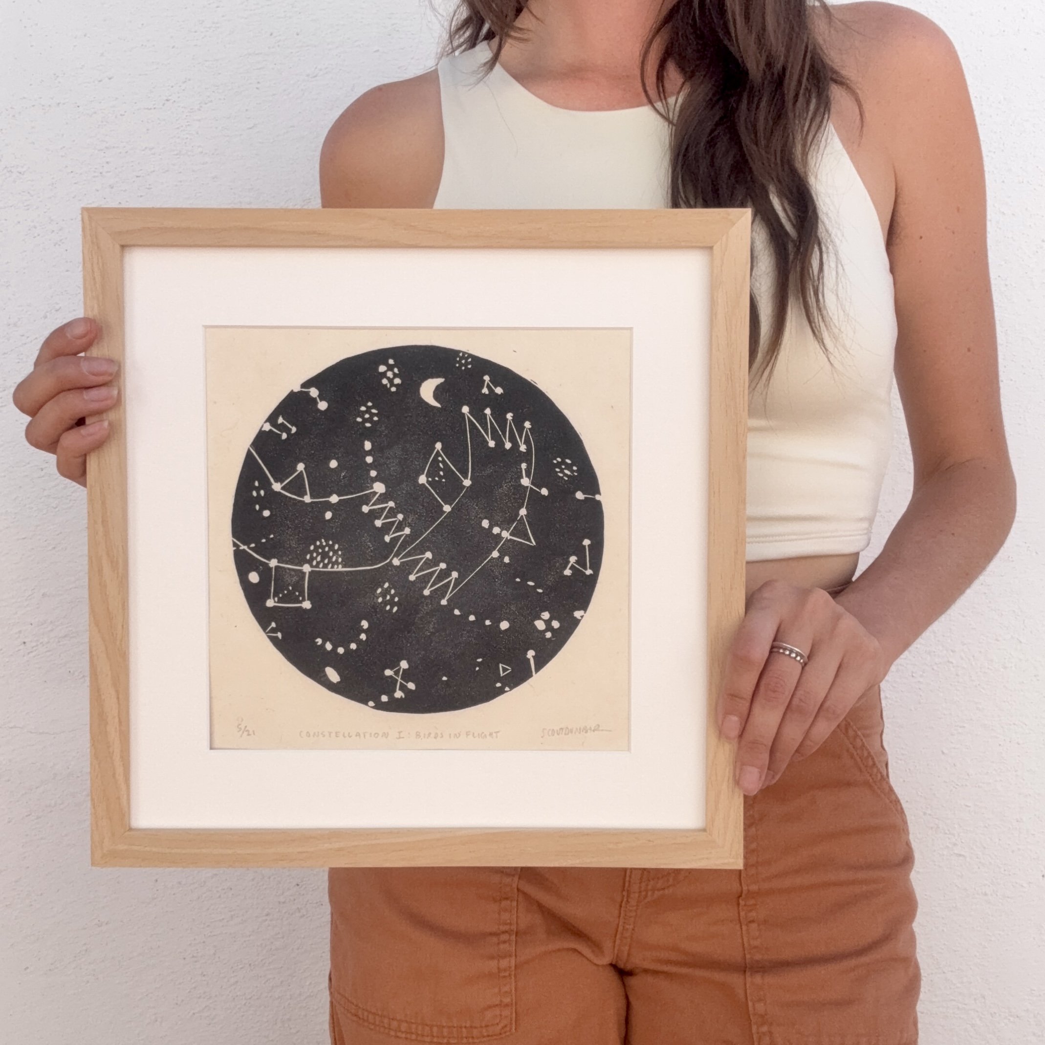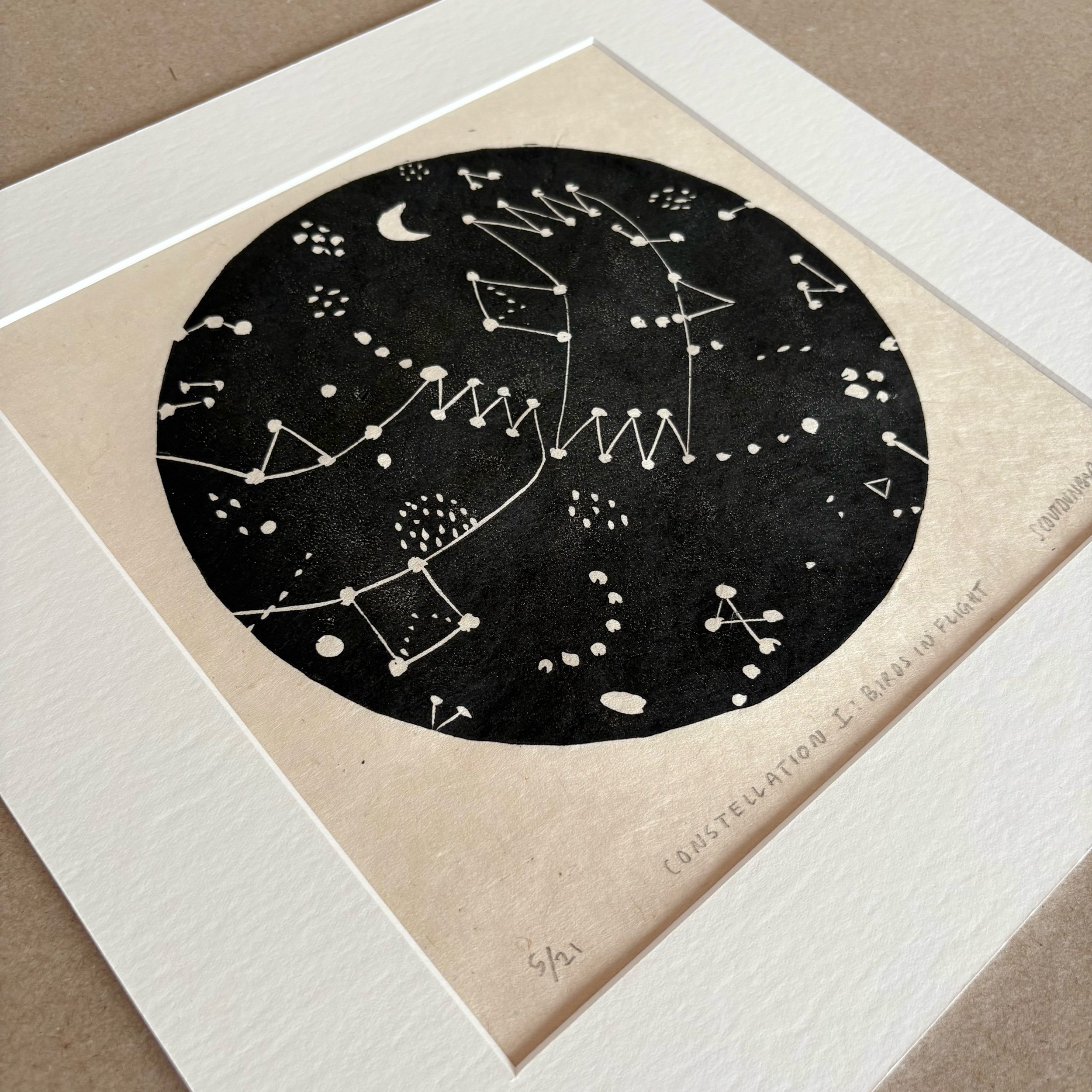 Constellation I : Birds in Flight is a limited edition linocut print made entirely by hand. Each print is numbered, titled, signed, and arrives professionally matted with an archival, warm white matboard.