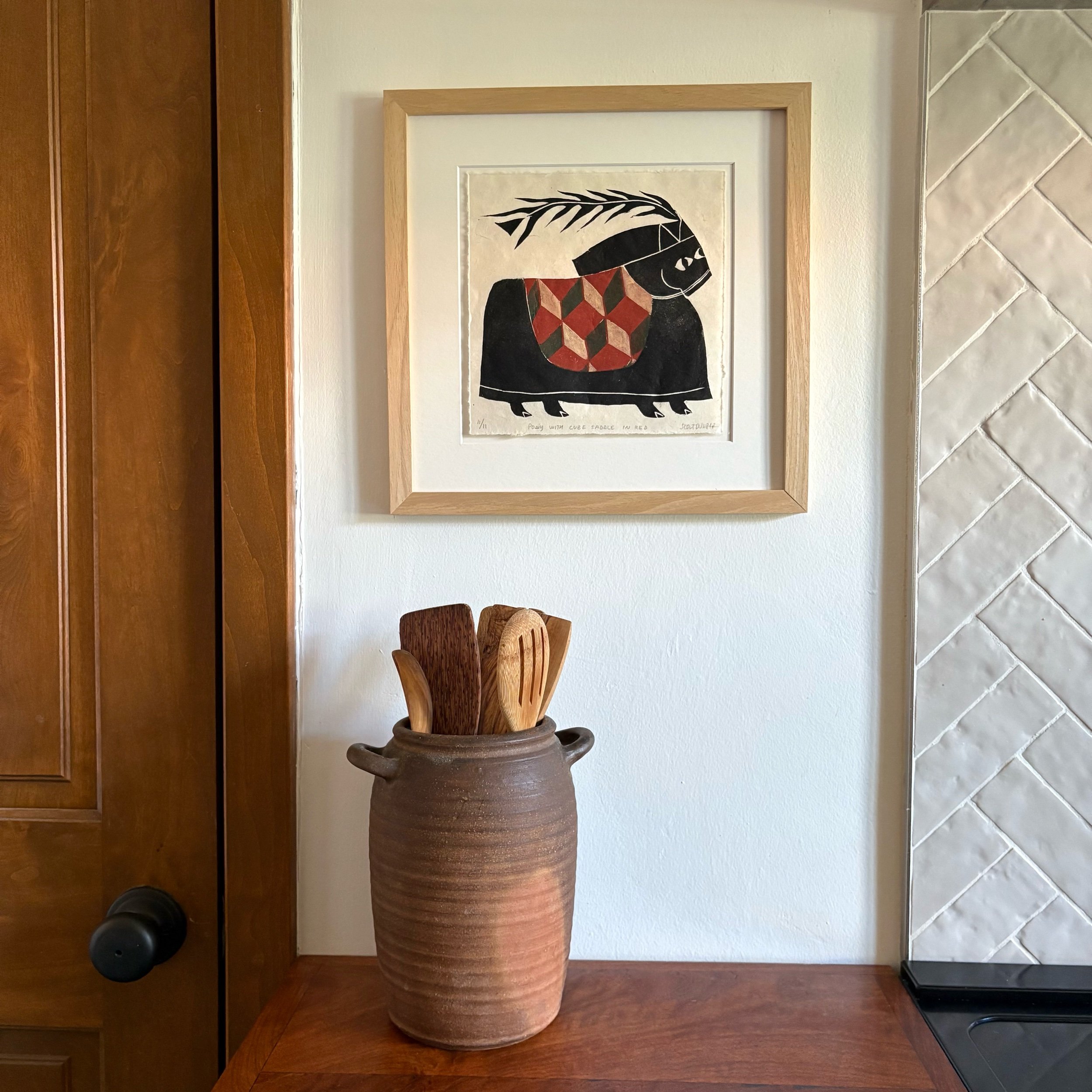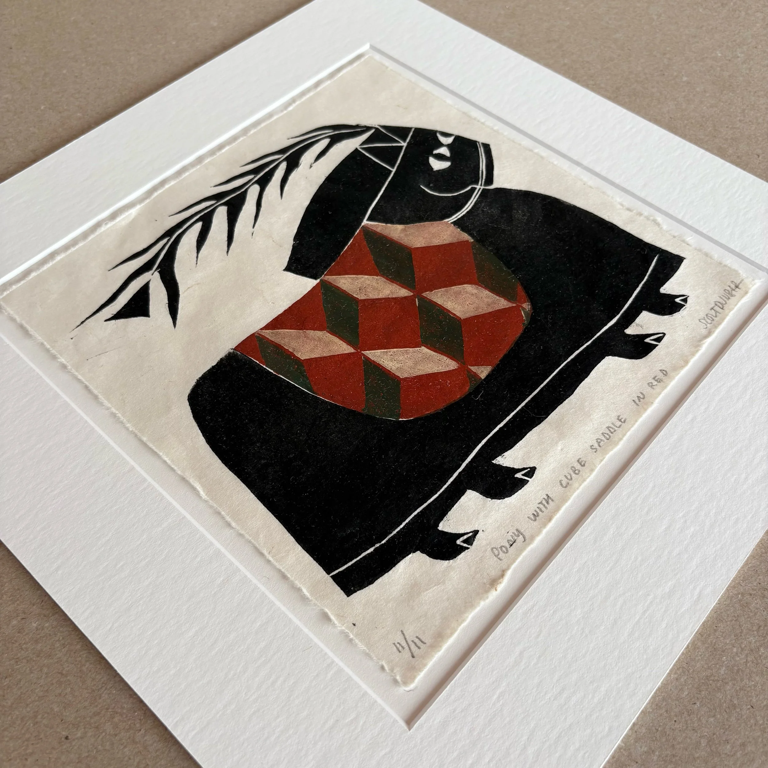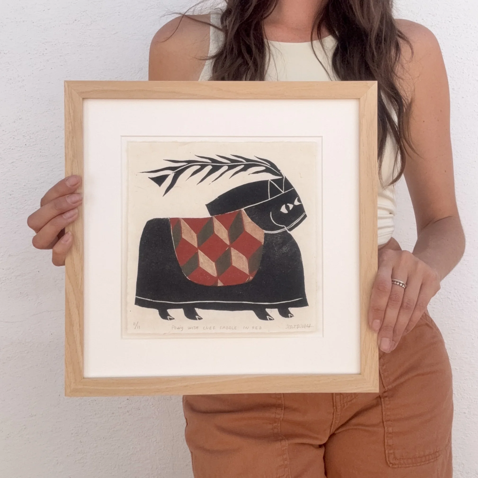 Pony with Cube Saddle in Red is a limited edition linocut print made entirely by hand. Each print is numbered, titled, signed, and arrives professionally matted with an archival, warm white matboard.