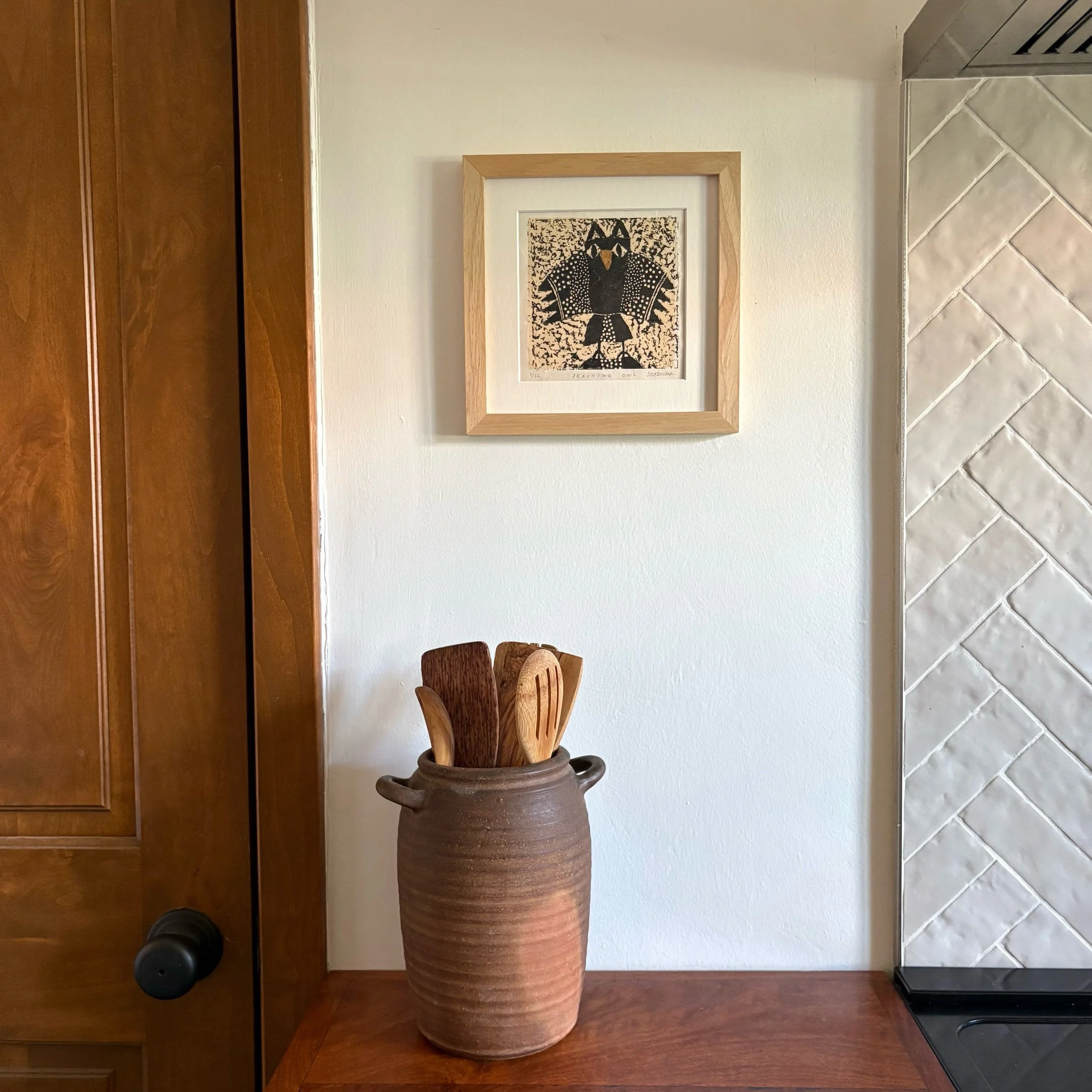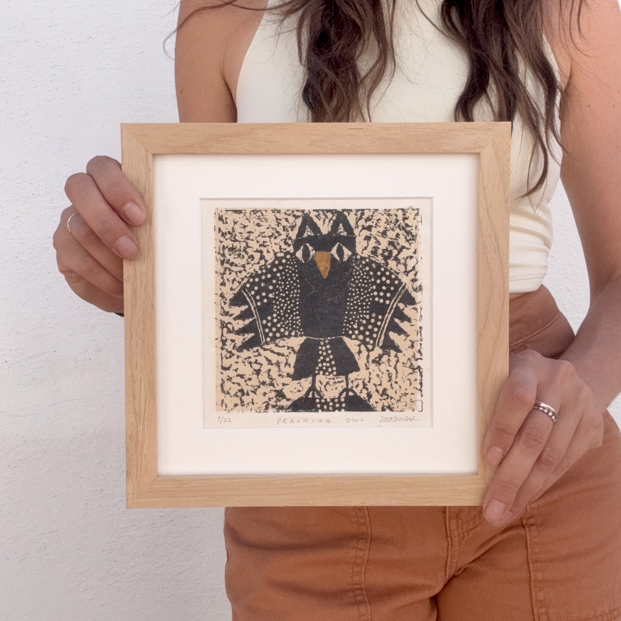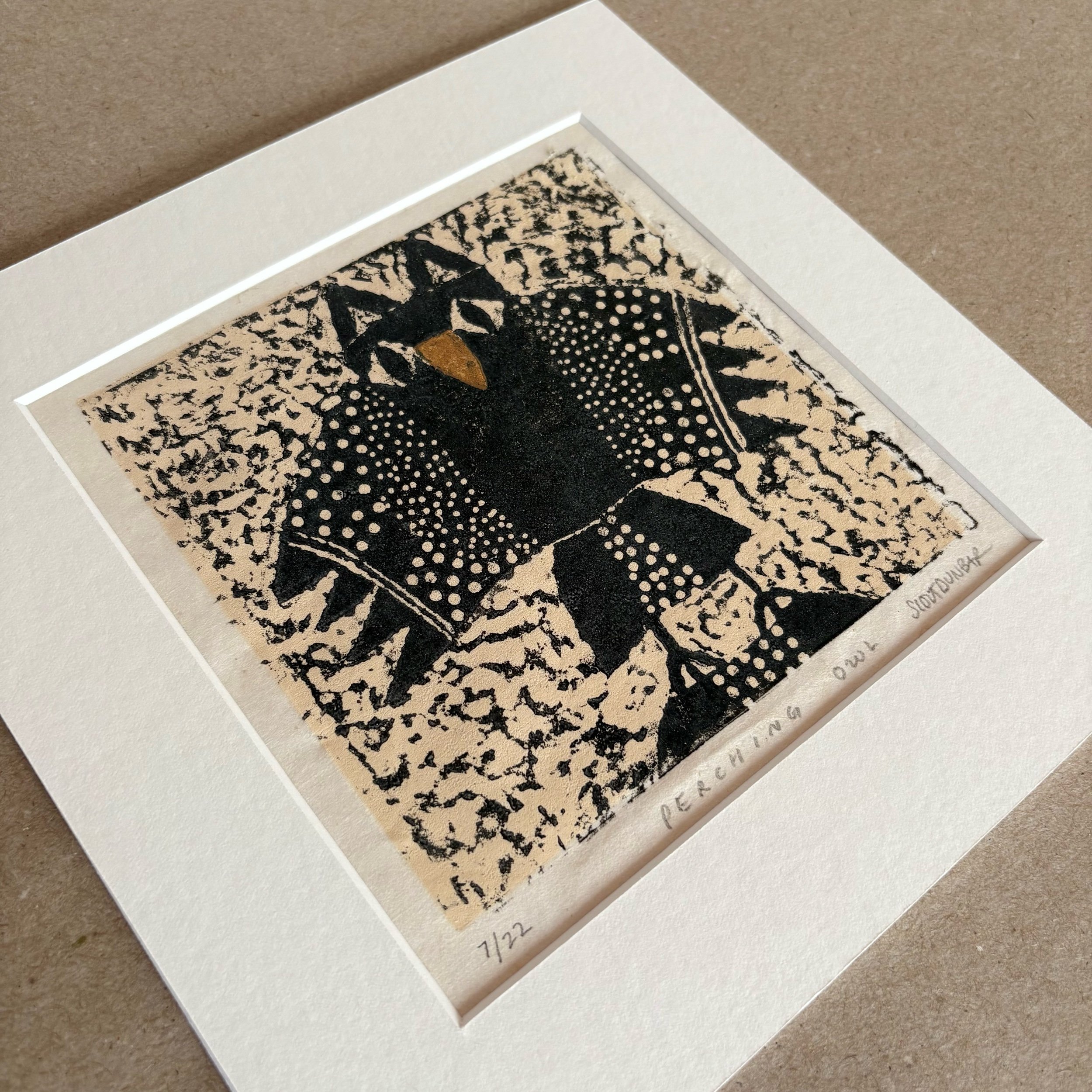 Perching Owl s a limited edition linocut print made entirely by hand. Each print is numbered, titled, signed, and arrives professionally matted with an archival, warm white matboard.
