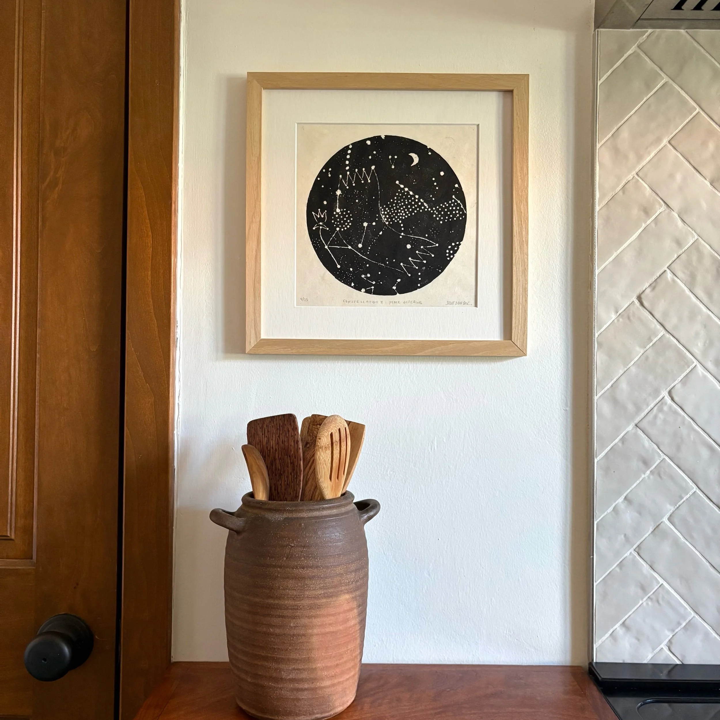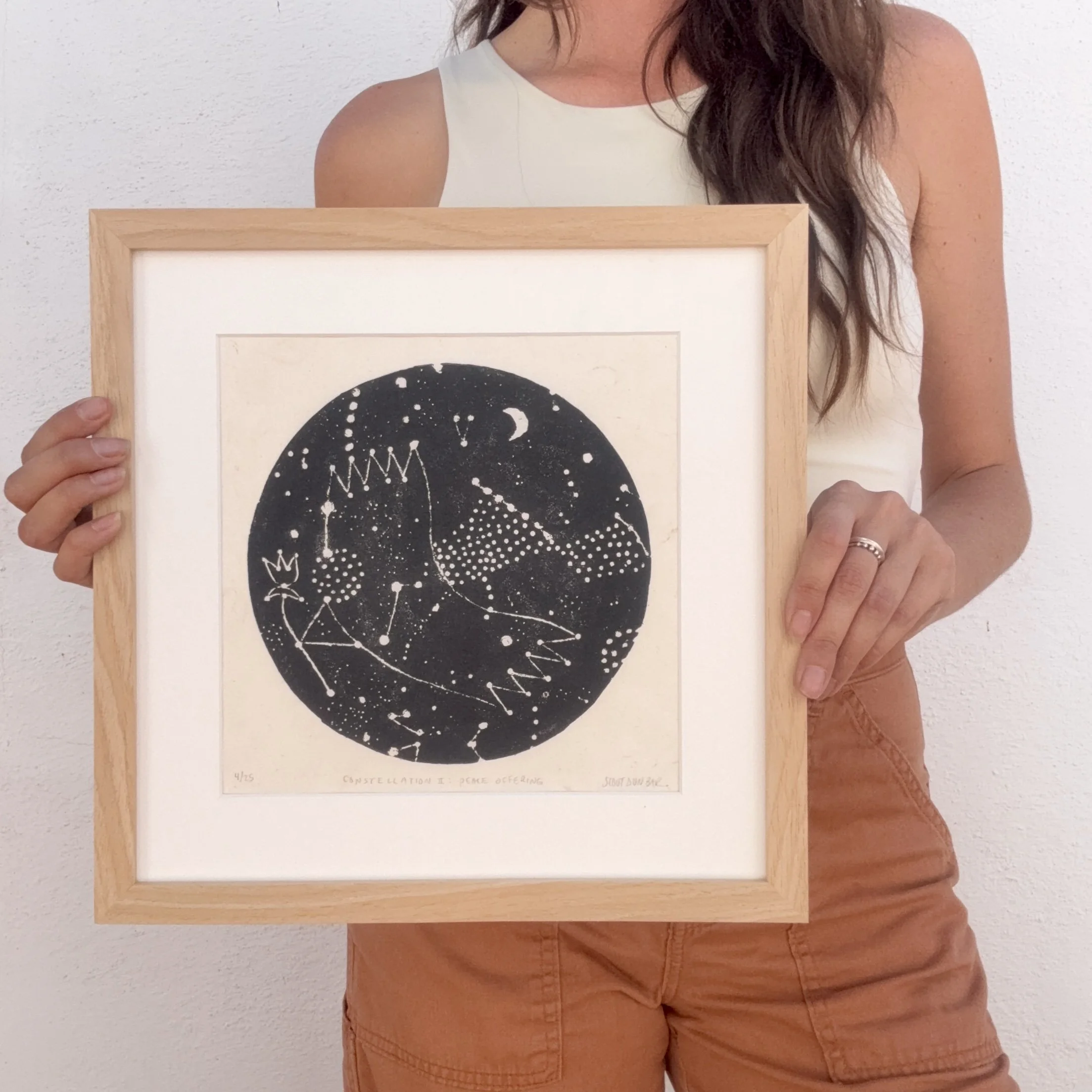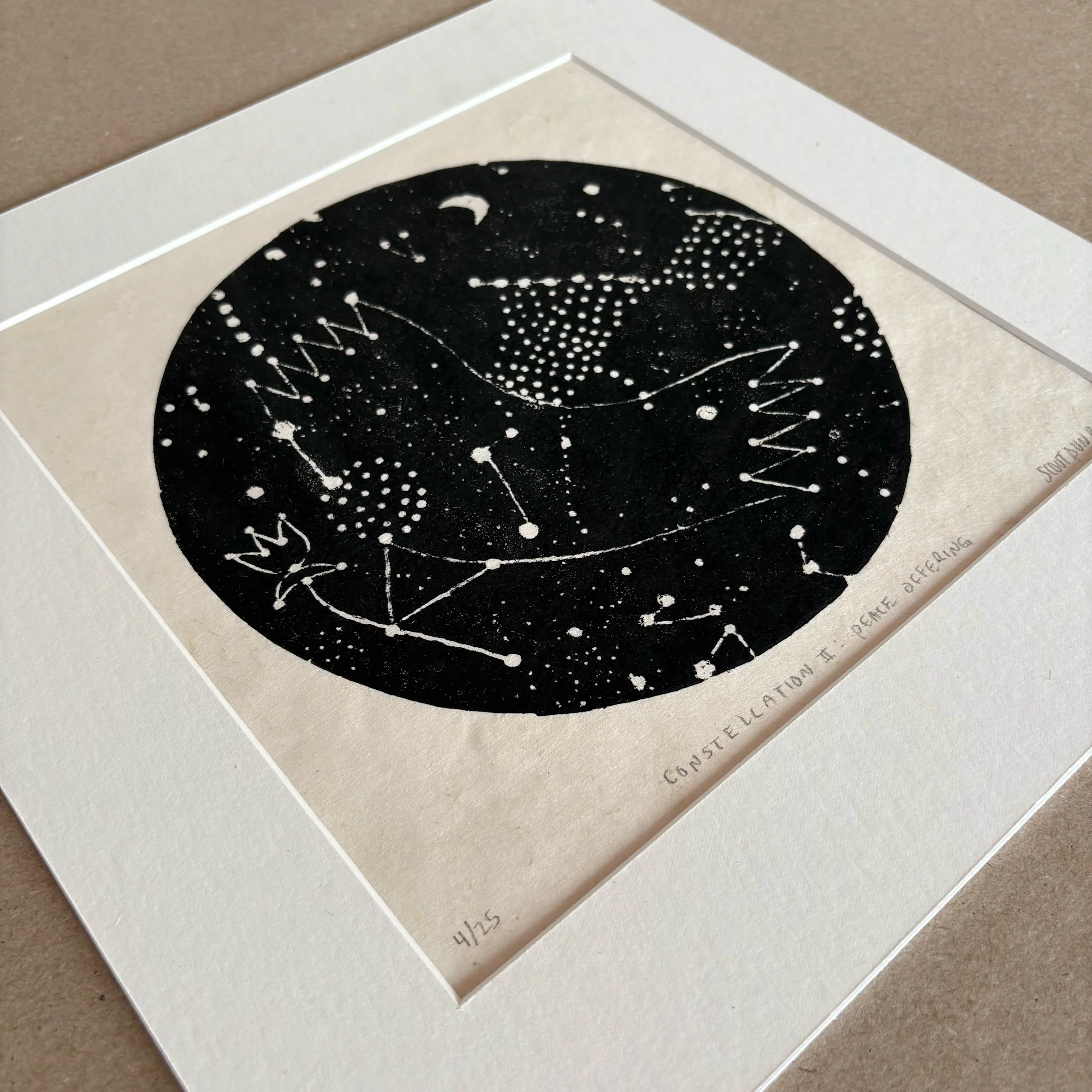 Constellation II : Peace Offering is a limited edition linocut print made entirely by hand. Each print is numbered, titled, signed, and arrives professionally matted with an archival, warm white matboard.