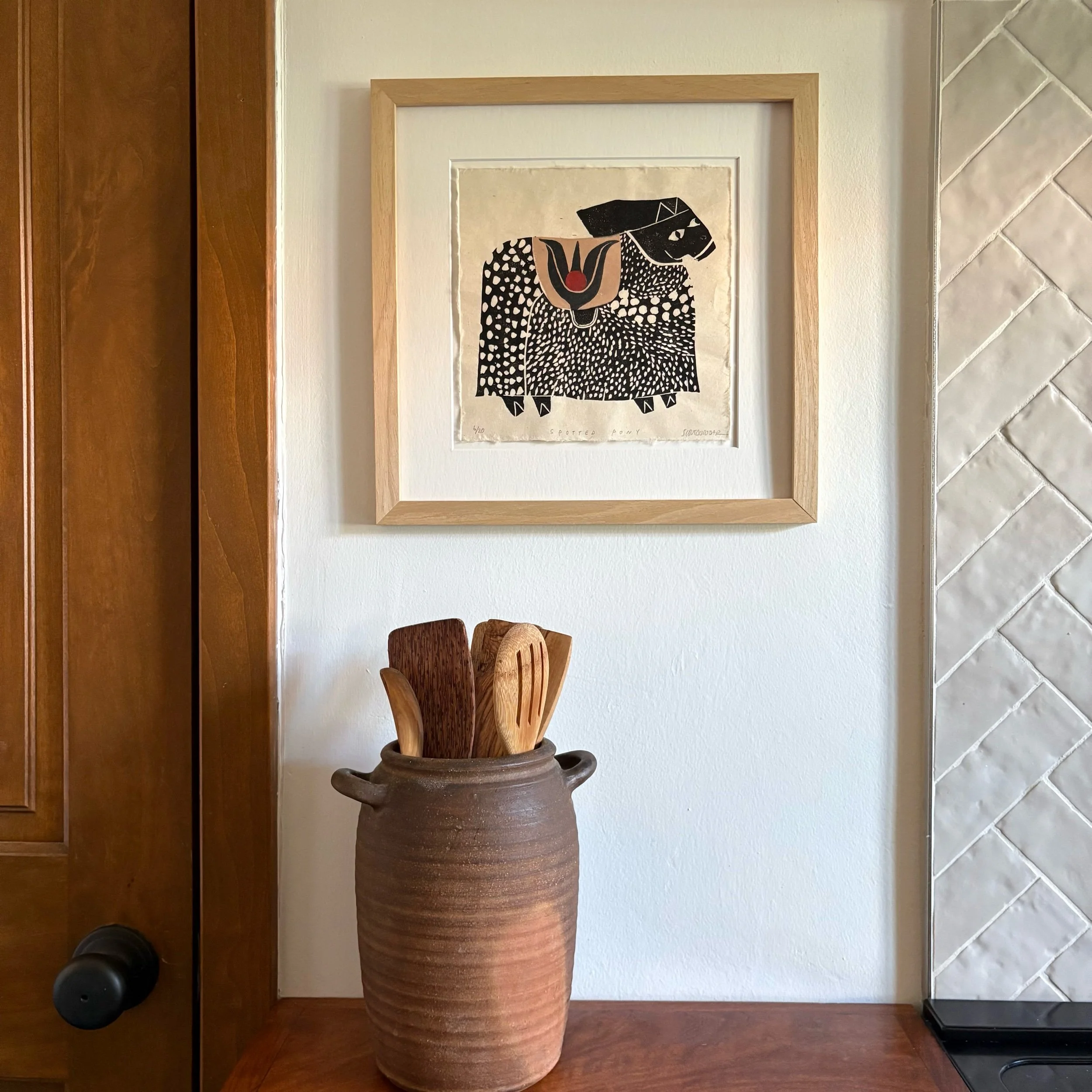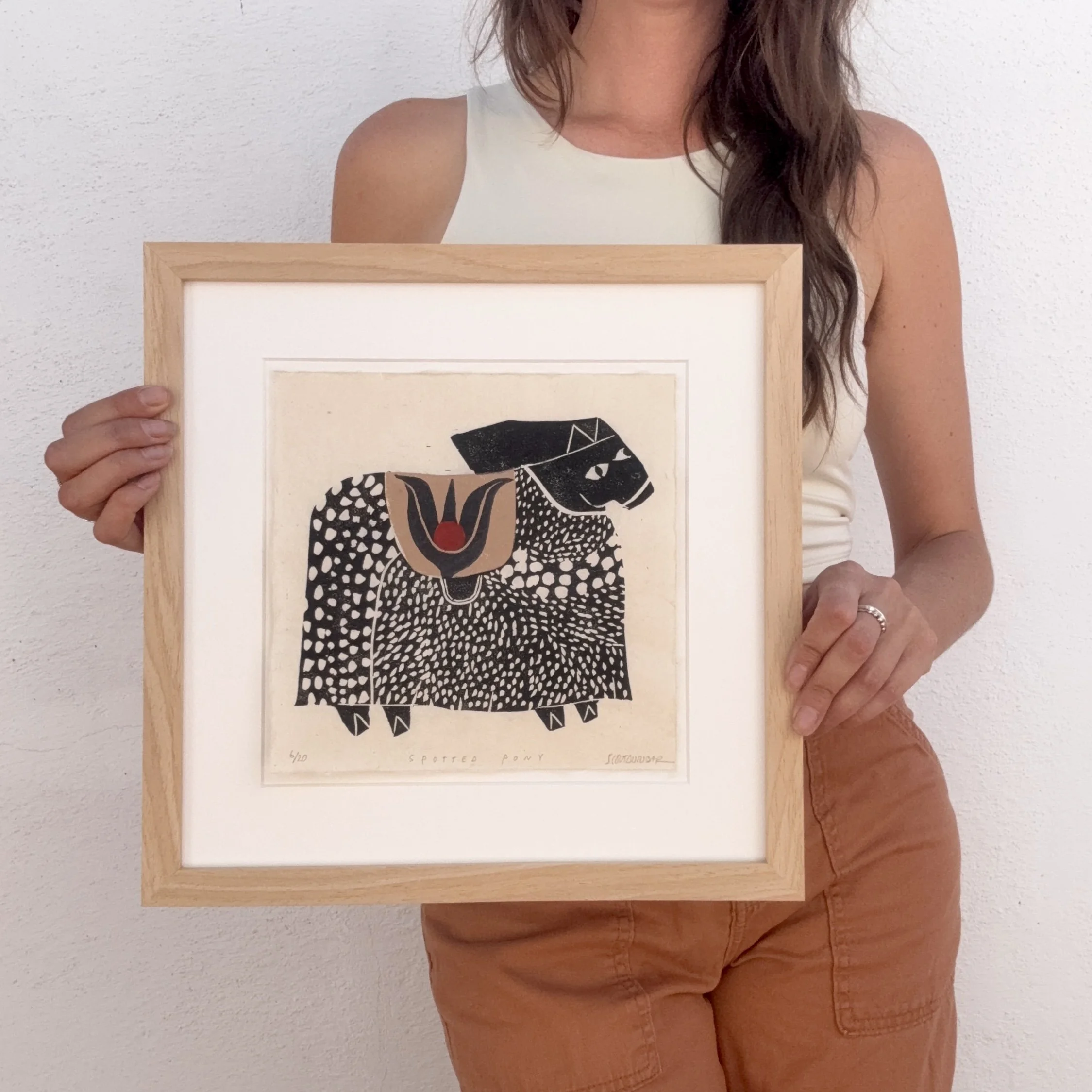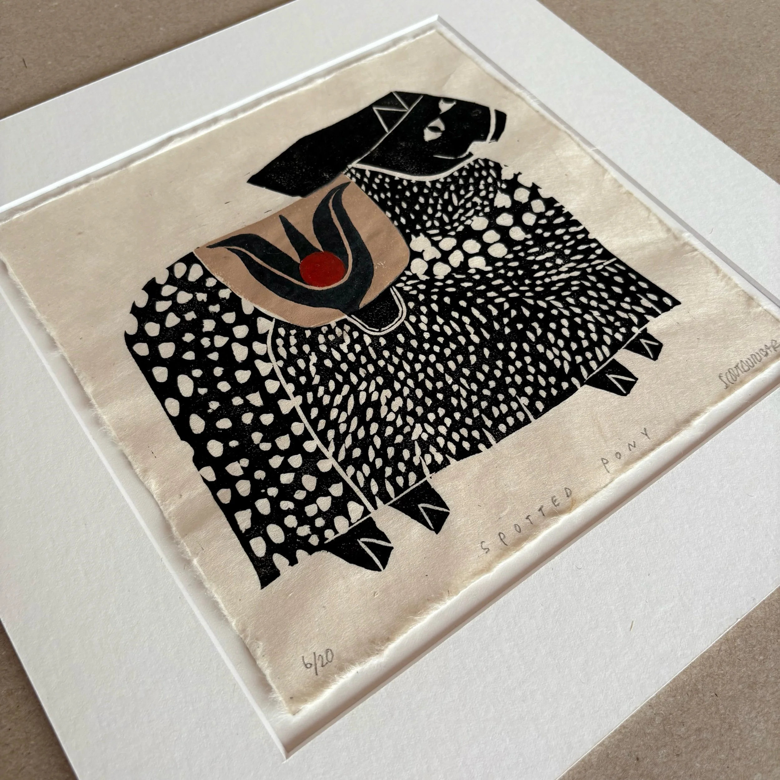Spotted Pony is a limited edition linocut print made entirely by hand. Each print is numbered, titled, signed, and arrives professionally matted with an archival, warm white matboard.