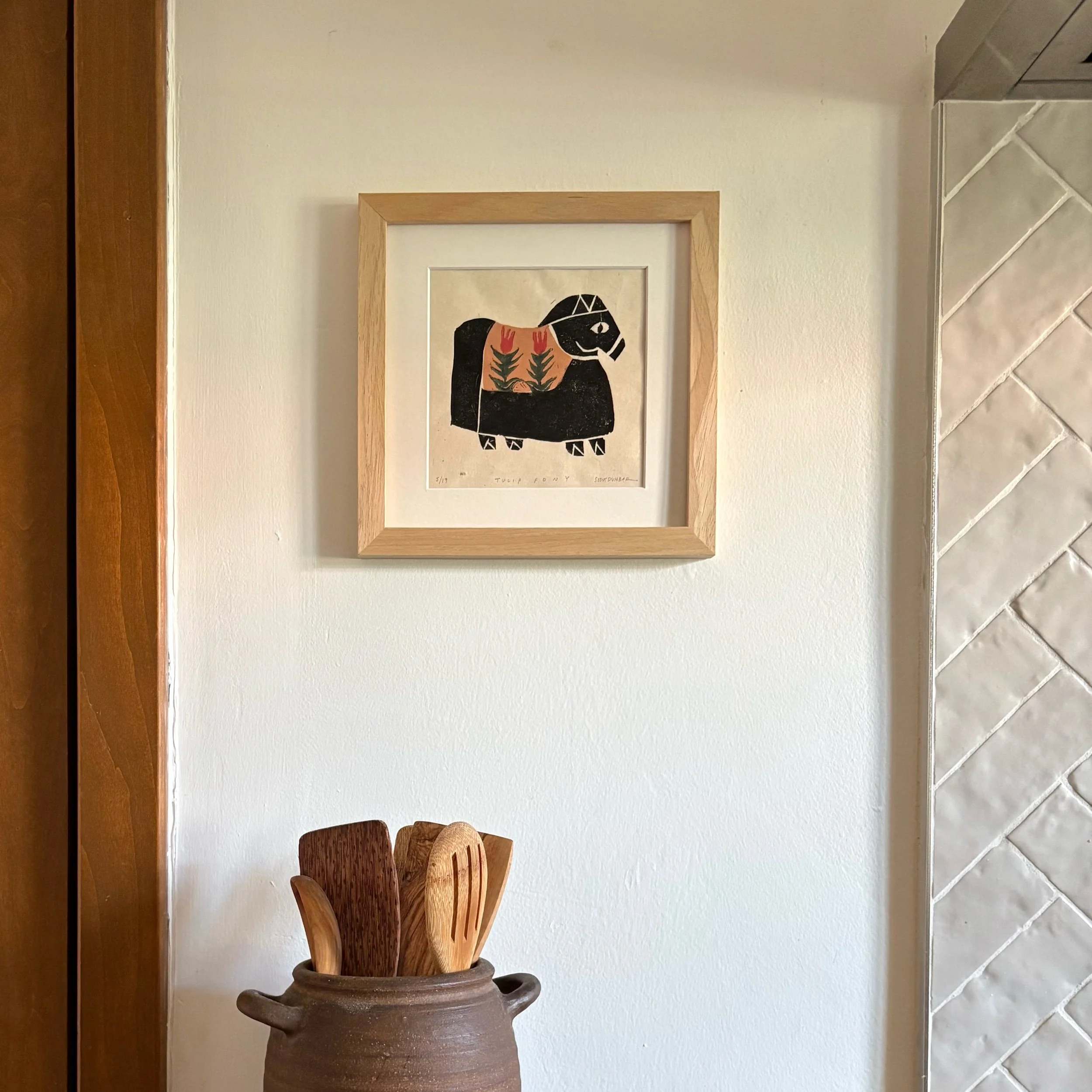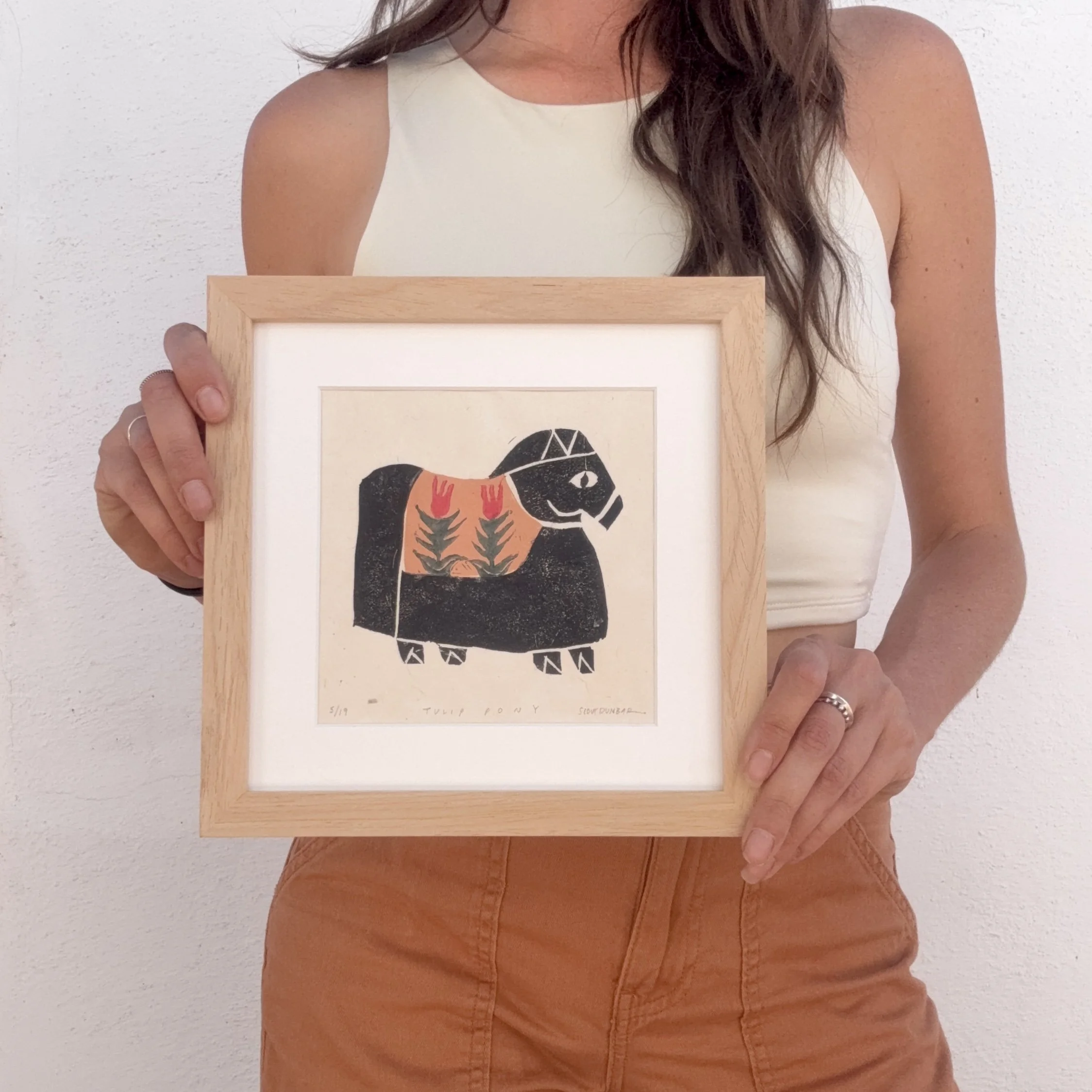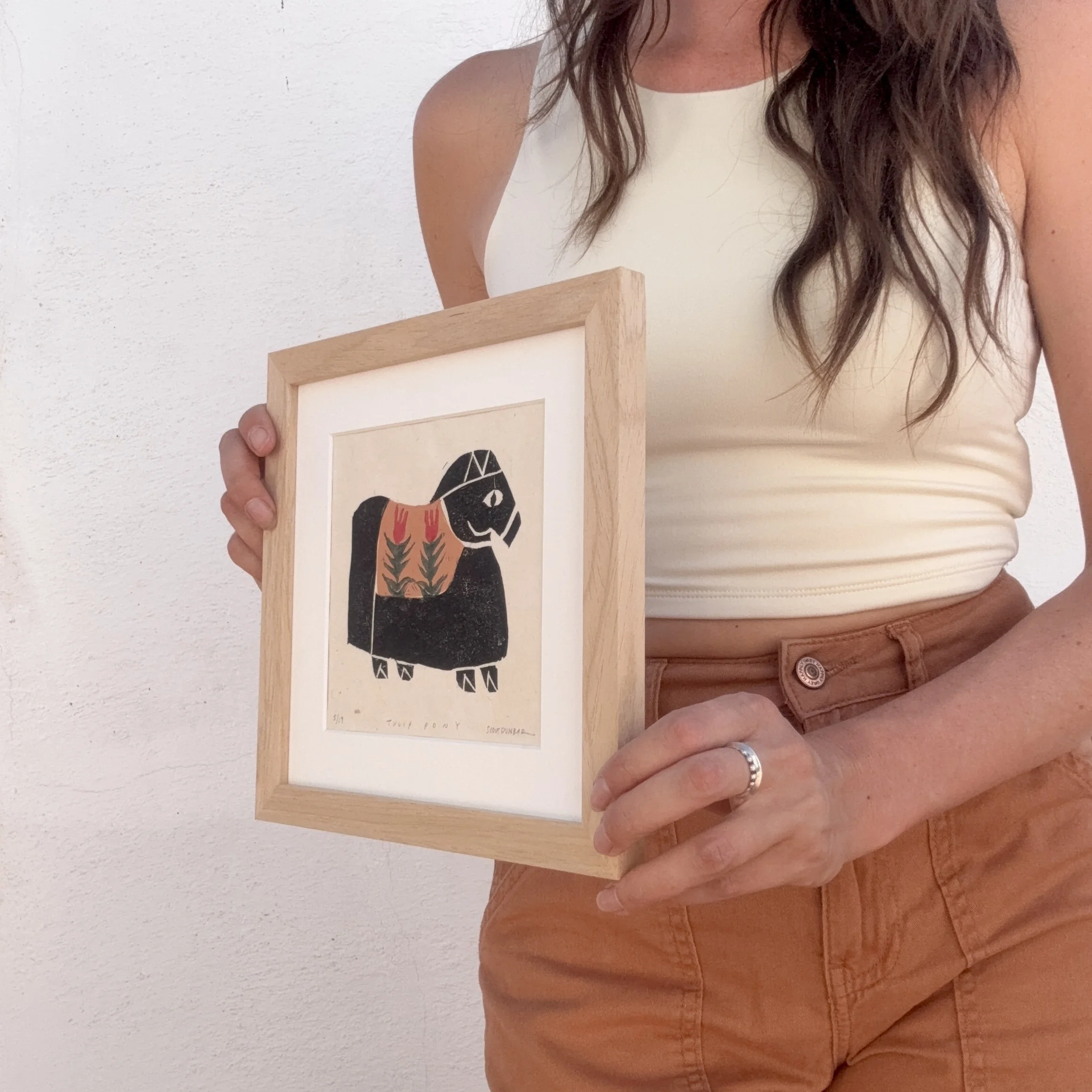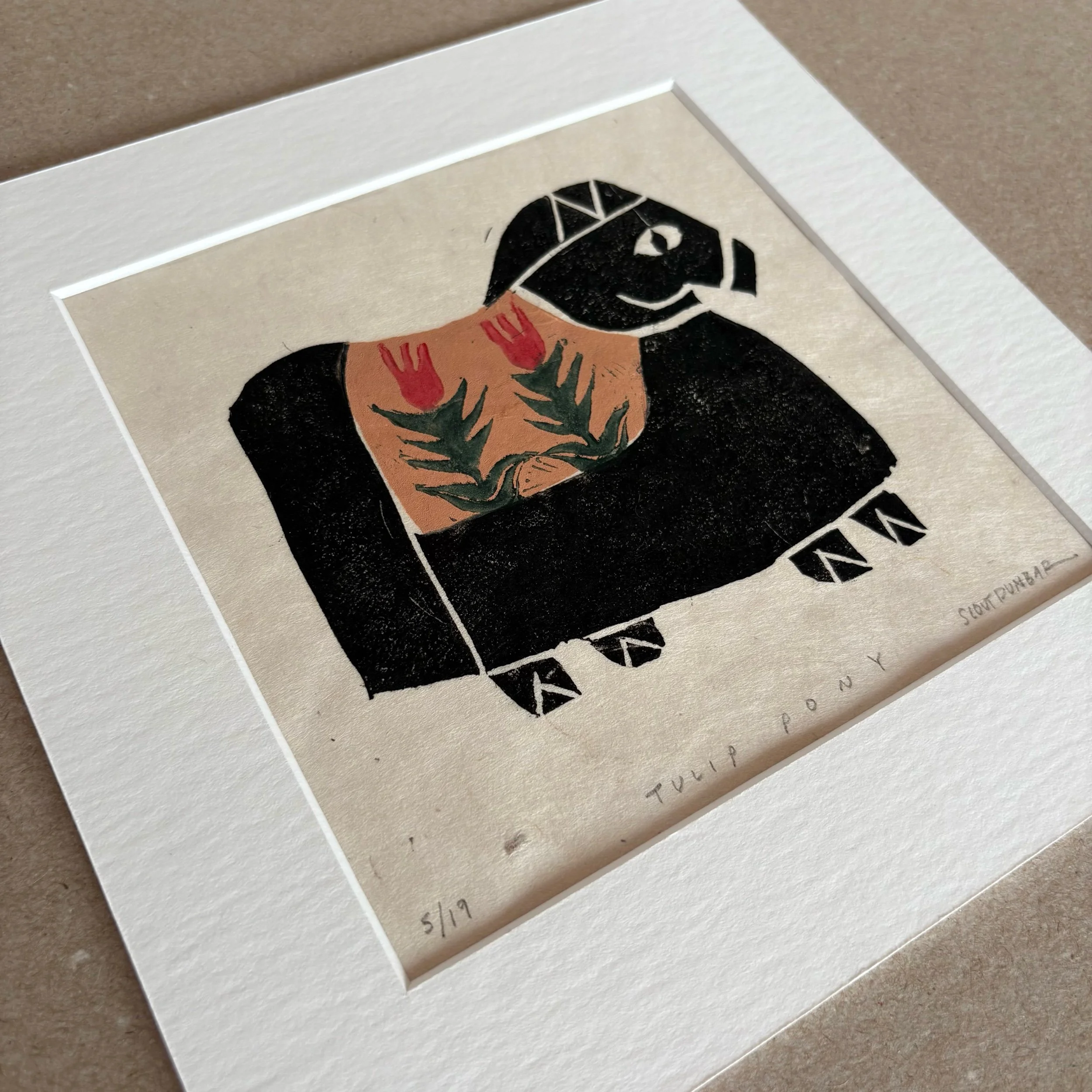 Tulip Pony is a limited edition linocut print made entirely by hand. Each print is numbered, titled, signed, and arrives professionally matted with an archival, warm white matboard.