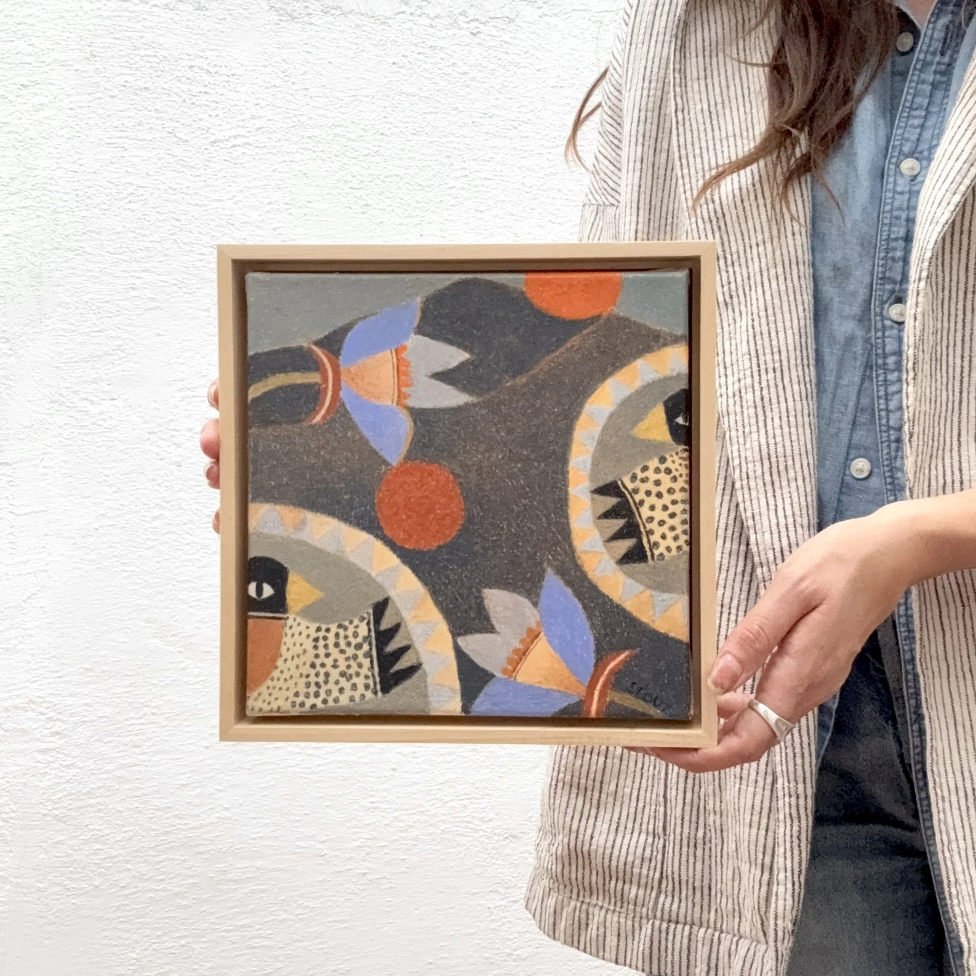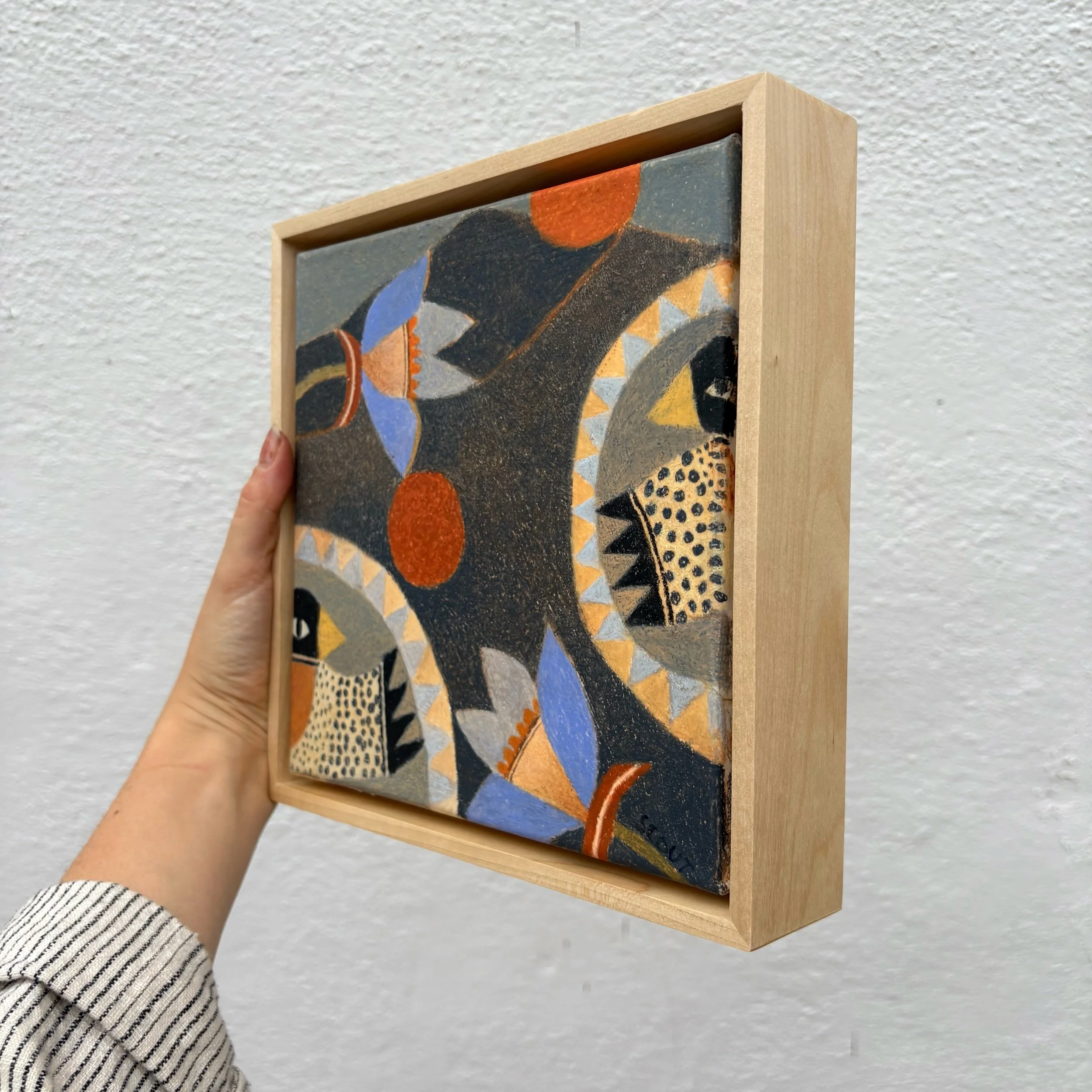 Still Life with Blue Daffodils is an original oil pastel drawing on canvas. Its framed dimensions are approximately 9”x9”. It is framed in maple wood, and its surface is gently painted with a UV protected matte varnish.