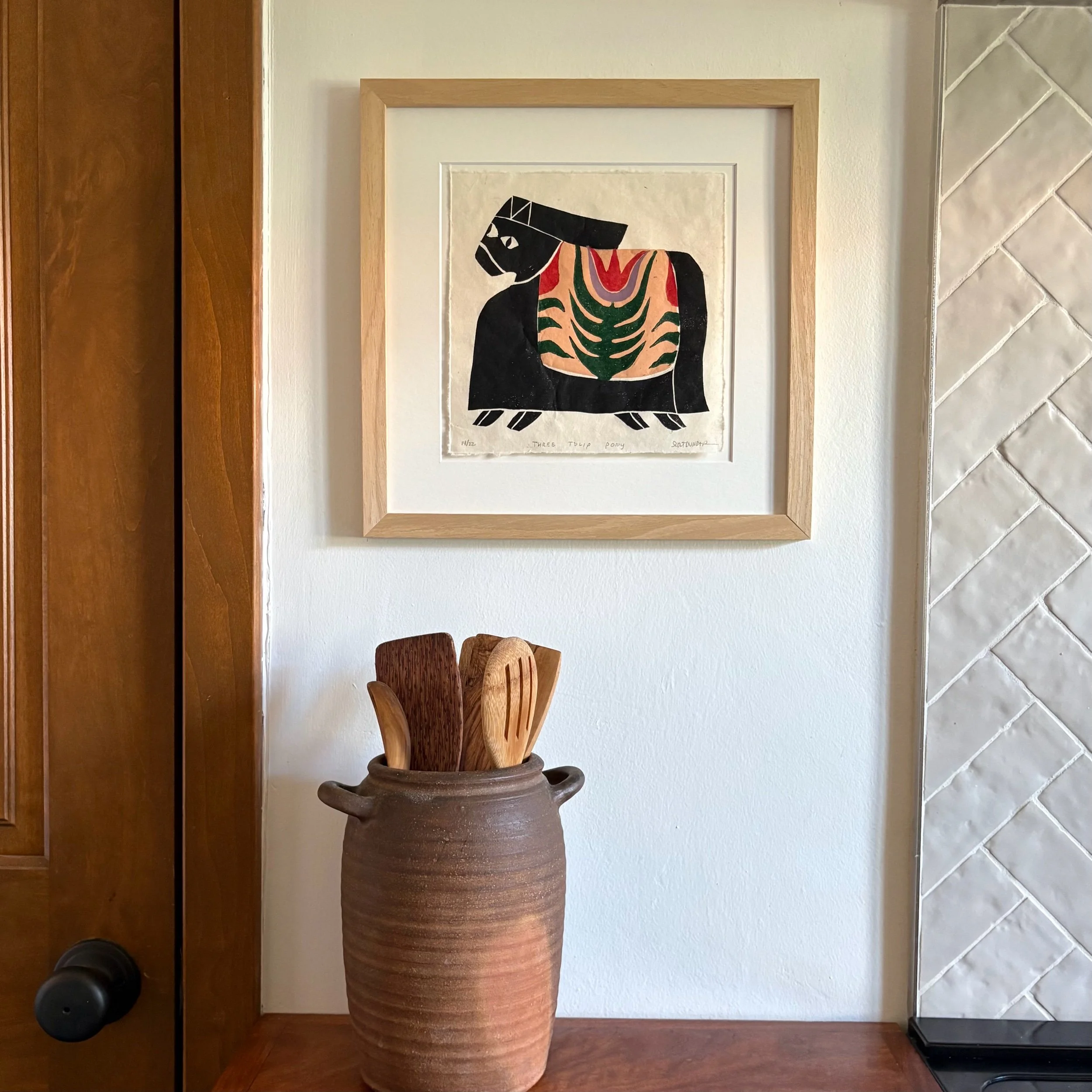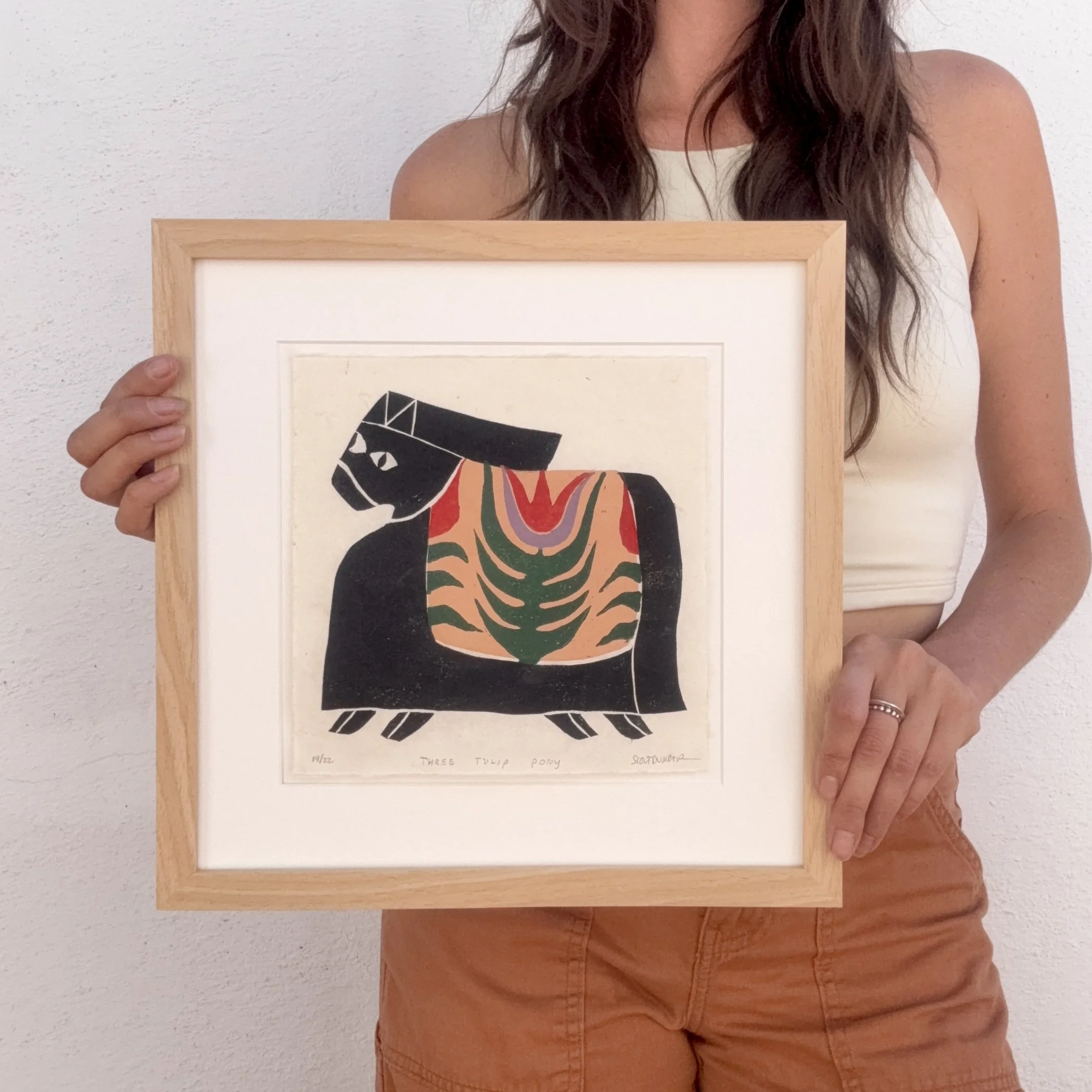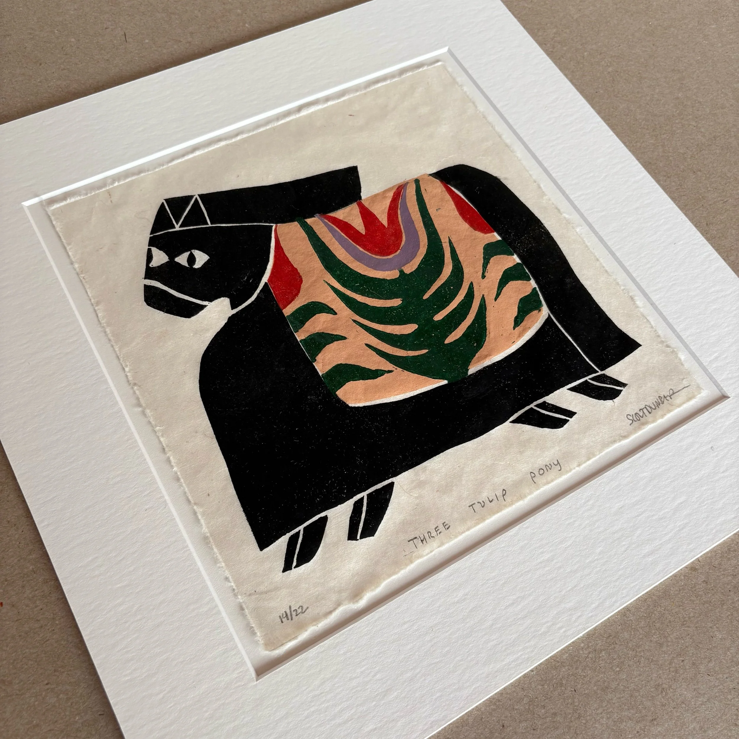 Three Tulip Pony is a limited edition linocut print made entirely by hand. Each print is numbered, titled, signed, and arrives professionally matted with an archival, warm white matboard.