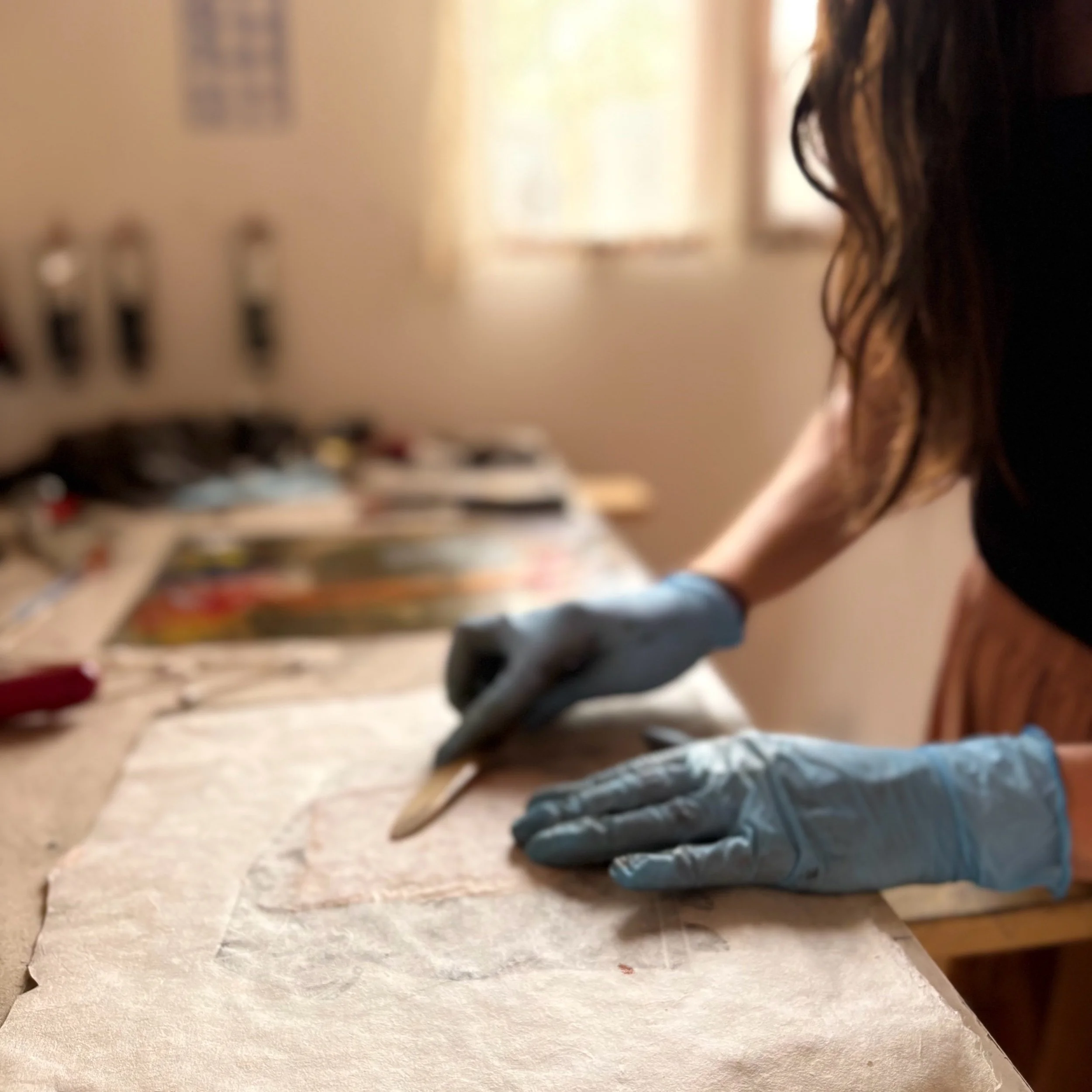 Please note that because each piece is hand-printed, no two works are the exact same. Expect subtle differences in color, ink consistency, and registration. While I iron every completed print flat, you may notice subtle, natural buckling in the mulberry paper.